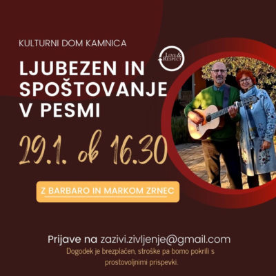 Veseli nas, da vas lahko ponovno obvestimo o glasbeno – družabnem dogodku LJUBEZEN IN SPOŠTOVANJE V PESMI IN BESEDI z Barbaro in Markom Zrnec, v nedeljo, 29.1. ob – 16.30h – 19.00 v Kulturnem domu Kamnica / Vrbanska cesta 97, 2351 Kamnica.